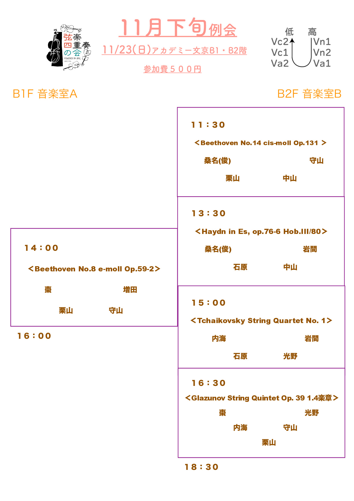 ◆参加者8名:vn守山さん,中山さん,光野さん,vn/va岩間さん,va栗山,石原さん,vc内海さん,棗さん, ◆希望曲:ベートーヴェン弦楽四重奏曲第14番 Op. 131 チャイコフスキー弦楽四重奏曲第1番 グラズノフ弦楽五重奏 op.39 1,4楽章 ◆本番練習: