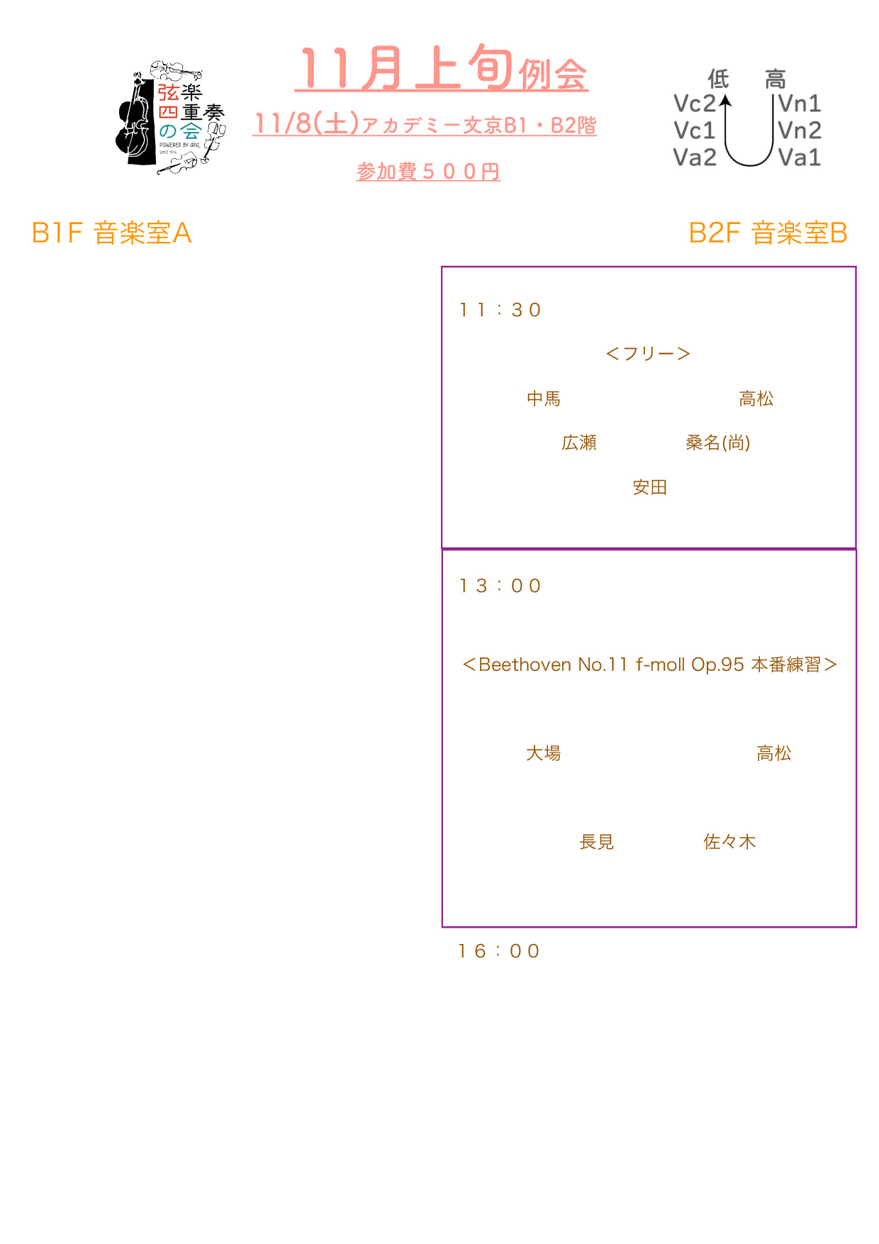 ◆参加者7名:vn高松さん,佐々木さん,va長見さん,安田さん,vc大場さん,中馬さん,広瀬さん ◆希望曲:Beethoven op.18より1曲 モーツァルトハイドンセットより1曲 ◆本番練習:Beethoven No.11 f-moll Op.95