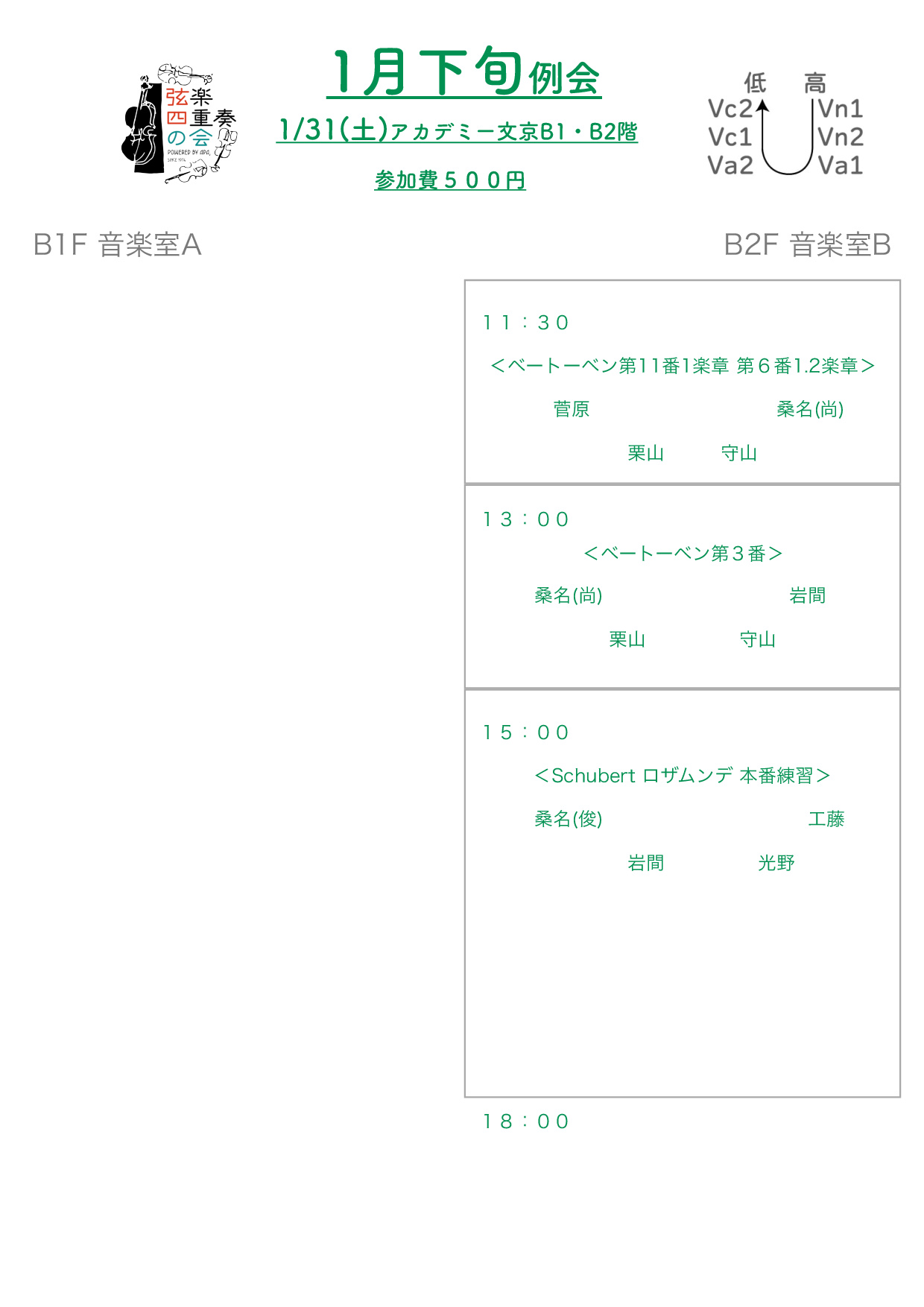 ◆参加者8名:vn工藤さん,光野さん,守山さん,vn/va岩間さん,vn/vc桑名(尚)さん,va栗山,vc桑名(俊)さん,菅原さん ◆希望曲:Beethoven 18-3 ・ベートーベン弦楽四重奏曲第11番セリオーソ/1楽章 ・ベートーベン弦楽四重奏曲第6番/1,2楽章 ◆本番練習:Schubert/ロザムンデ